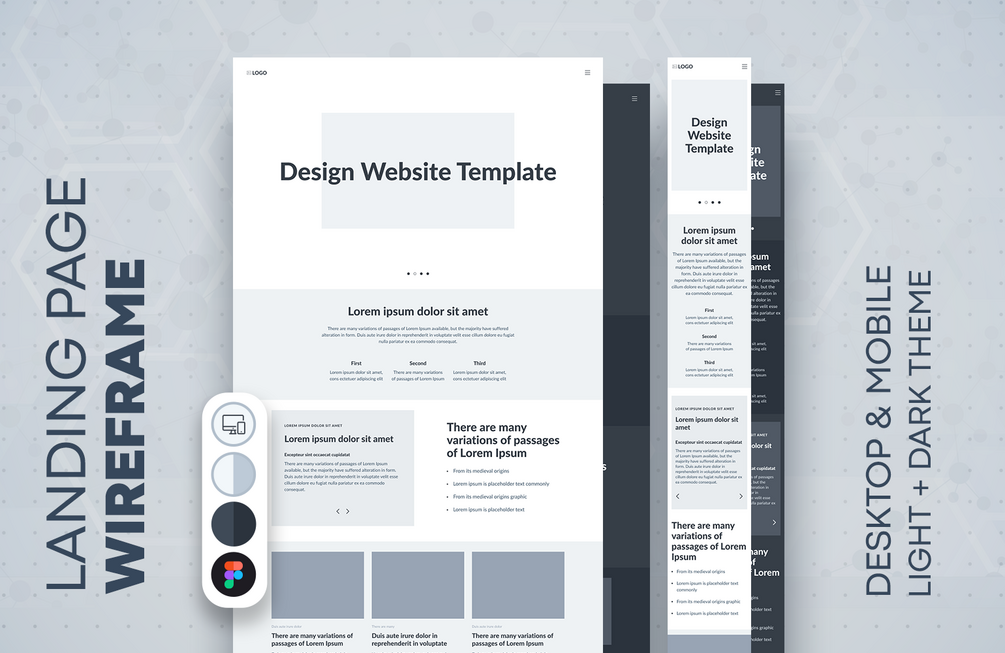 Landing page wireframe. Desktop and mobile templates. Flat modern responsive design. Light and dark themes.